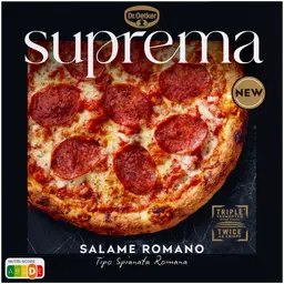 VEHNÄJAUHO, 12% tomaattisose, 10% MOZZARELLA-JUUSTO, 9, 4% kirsikkatomaatti, vesi, 8, 1% salami (sianliha, silava, suola, mausteet, dekstroosi, stabilointiaine (natriumnitriitti), hapettumisenestoaine (rosmariiniuute), aromi, savu), 6, 0% tomaattipyre, EDAM-JUUSTO, rapsiöljy, 2, 6% extra virgin oliiviöljy, basilika, hiiva, suola, sokeri, persilja, valkosipuli, sipuli, oregano, pippuri, sitruunamehu, paprika, paahdettu sipuli