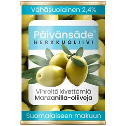 mustat oliivit, vesi, suola, stabilointiaine (E579). Steriloitu. Gluteeniton. Koneellisesta kivenpoistosta johtuen oliiveissa saattaa olla kiviä tai niiden osia.