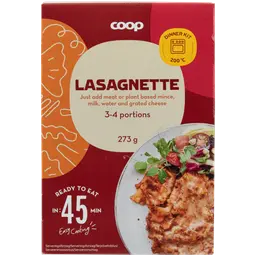 Ainesosat: Lasagnelevyt 65%: DURUMVEHNÄJAUHO. Saattaa sisältää kananmunaa ja soijaa.|Kastikeainekset 35%: Tomaattipyrejauhe¹ 31%, tärkkelys, VEHNÄJAUHO, jodioitu suola, sokeri, hiivauute, maissiöljy, mausteet (mm. valkosipuli¹ 0, 8 % ja paprikajauhe), hydrolysoitu kasviproteiini, kaliumkloridi, aromi, suola, porkkana¹, JUURISELLERI¹, sipuli¹, yrtit (oregano¹ ja basilika 0, 1%), glukoosisiirappi, savuaromi. Saattaa sisältää kananmunaa, maitoa, sinappia, soijaa ja muita gluteenia sisältäviä viljoja. ¹Kestävän kehityksen periaatteiden mukaisesti toimivilta maatiloilta, lue lisää: www.knorr.com/fi|"