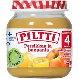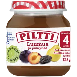 PILTTI Luumuinen on sokeroimaton hedelmäsose päärynästä ja luumusta, 100% hedelmää. Sopii välipalaksi tai jälkiruoaksi lapsille 4 kuukauden iästä…