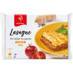 Vesi, koneellisesti erotettu broilerinliha 16 % (Suomi), tomaatti, pastalevy [VEHNÄjauho, vesi, KANANMUNAjauhe, kasviöljy (rypsi, rapsi), jodioitu suola], laktoositon KERMA, porkkana, sipuli, maissitärkkelys, JUUSTO, sulateJUUSTO [JUUSTO, vesi, VOIöljy, sulatesuolat (E 331, E 340, E 452)], SOIJAkastike (vesi, SOIJApapu, suola, etikka), valkosipuli, basilika, oregano, jodioitu suola, timjami, karamellisoitu sokeri, mustapippuri.