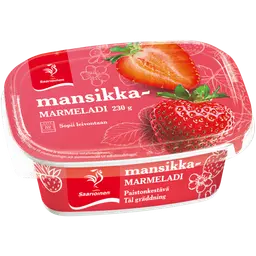 Mansikka, sokeri, vesi, sakeuttamisaineet (E 440, E 410), happamuudensäätöaineet (E 330, E 333), säilöntäaine (E 202), aromi, värit (E 120, E 160a). 100 g tuotetta sisältää 40 g marjaa.