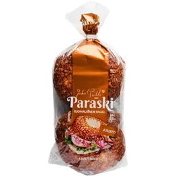 VEHNÄJAUHO, vesi, TÄYSJYVÄVEHNÄJAUHO, DURUMVEHNÄJAUHO, hiiva, sokeri, rapsiöljy, suola, kuivattuVEHNÄTAIKINAJUURI, säilöntäaine (E 282, E 200), emulgointiaine (E 471) ja jauhonparanne (E 300). Saattaa sisältää pieniä määriä seesaminsiemeniä. Vehnän alkuperämaa on EU ja ei-EU. SULATETTU, ei saa jäädyttää uudelleen.